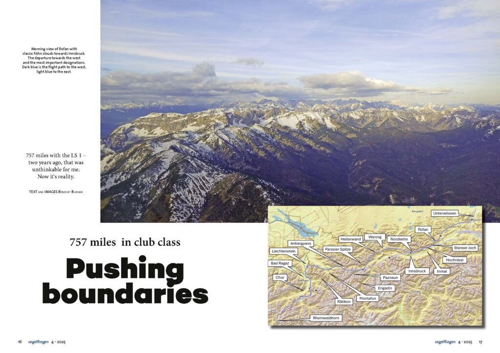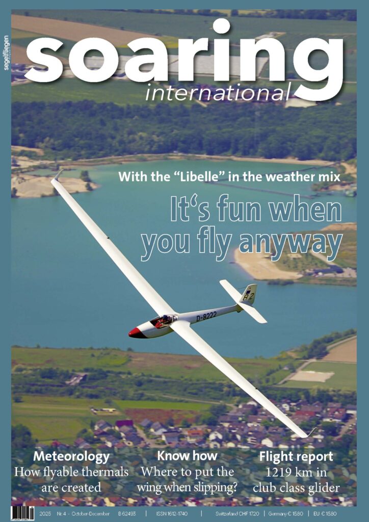 Here it is, our latest issue! Once again, we have put together a colorful selection of exciting, fascinating, and informative articles for you. These include some fantastic cross-country flights: with a Libelle in mixed weather, 1,200 kilometers with a club-class glider, a road movie with the Stemme, and a daring flight with the ASK 18. Our Sposos also report on their summer of performance flying, our meteorologist explains how workable thermals are created, you will learn where the wing should point during a slip and how wind influences an optimized winch launch. A pilot whose accident ended without serious consequences reports on how important it is to assess the terrain, especially in the mountains. Our oldie fans can look forward to the Skylark “Feldlerche”, which is becoming a star as an oldie, and those who enjoy reading about history will be taken back to the beginnings of the motor glider era and the long road to the B13e turbo-electric glider. Of course, there is also news, including the successor to Easy Memory and the IRIS All-in-one from LX Navigation. And finally, something to dream about, a visit to a gliding painter.